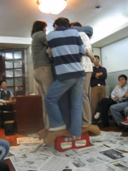 第二組的成員在組長(zhǎng)的帶領(lǐng)下,全組成員團(tuán)結(jié)一致,緊緊得抱在一起,堅(jiān)持了20分鐘,取得了第一名。