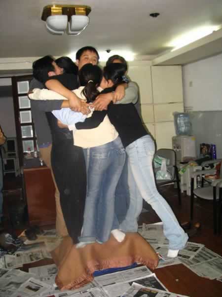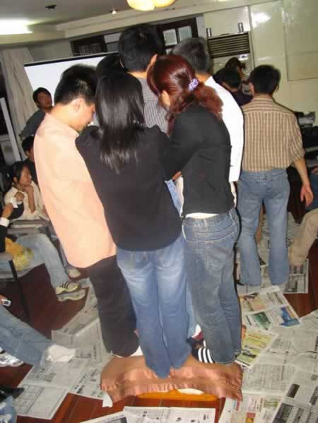 “抱團(tuán)打天下”游戲:7人合力站在小小的啤酒箱上,堅(jiān)持1分鐘以上才算過(guò)關(guān)。此游戲可以訓(xùn)練團(tuán)隊(duì)合作精神,考驗(yàn)意志力和增強(qiáng)組員的相互協(xié)調(diào)與團(tuán)結(jié)能力。
