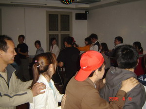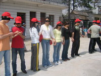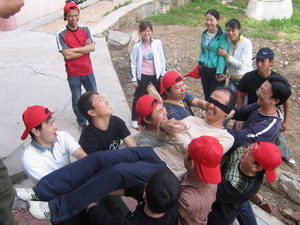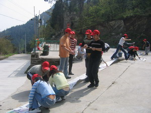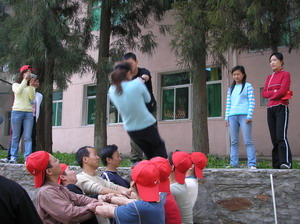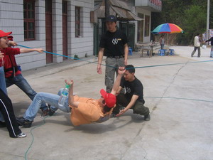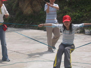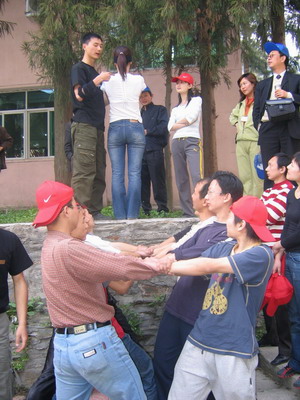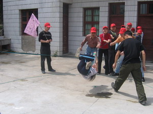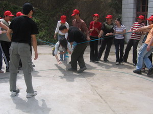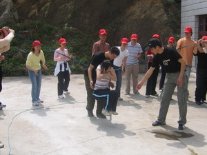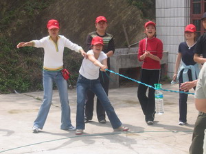 雷陣取水(在一個直徑4米的地面中間有一個裝滿水的杯子(作為假設的地雷),我們有的工具就是繩子和人,并且繩子和人都不能接觸圈內的地面的情況下取出杯子,而且滴水不能灑。想一想可能嗎?當然可以,團隊的智慧和潛力是不可估量的。我們在5分鐘的時間里做出了8種方案,利害吧:)