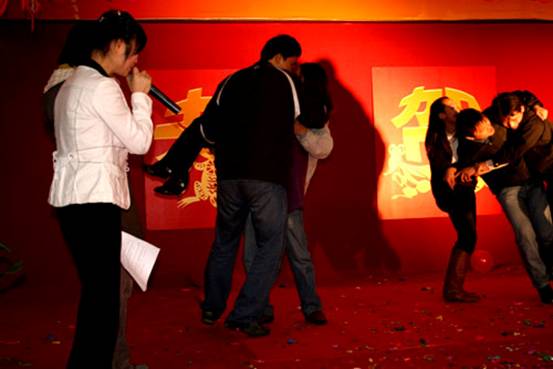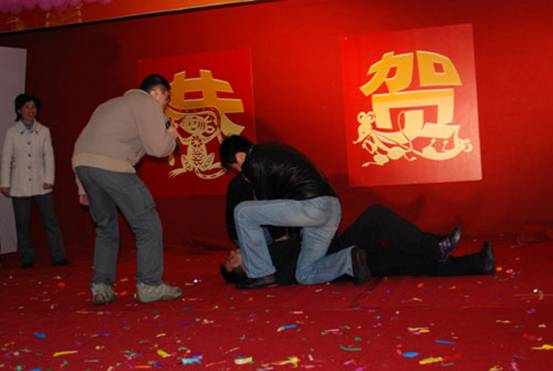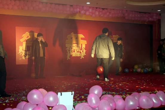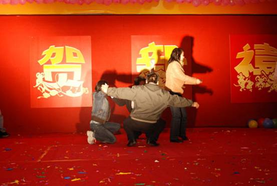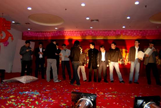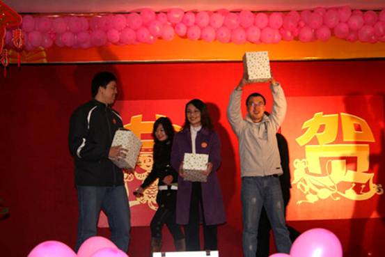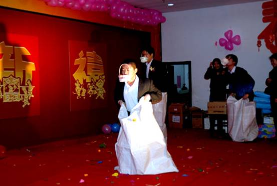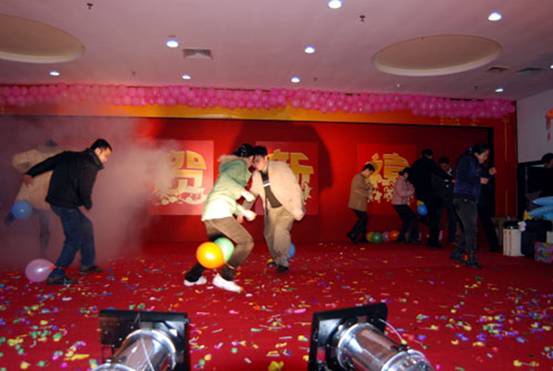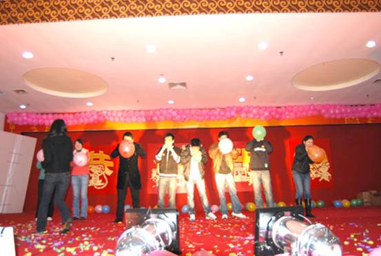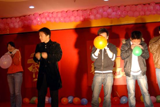 首先請出的是鼠年本命年的幸運同事上臺,他們將得到一份精美的禮品,郵票幸運封。同時他們也要參加今天的第一個游戲節目,比賽吹氣球。比賽規則是規定的時間內,誰把氣球吹爆的多,誰就是冠軍。每位參賽者不僅可以得了一份價值不菲的禮物,獲勝冠軍還有特別的禮物領取。