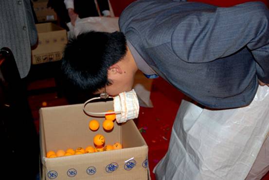 真正考驗大家的時候到了,下一個游戲項目是運球接力賽,主持人宣布每桌派出三名同事上臺,根據規定必須用嘴咬住籃子,將小球從舞臺的一邊運輸到對面一邊的椅子上,而且必須把自己裝進布袋里前進,這個難度可真不小啊!
