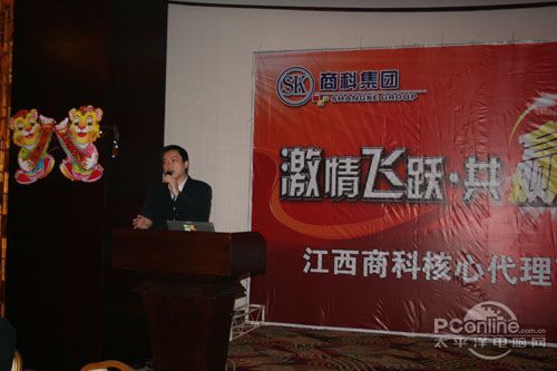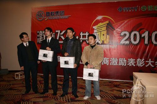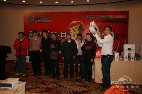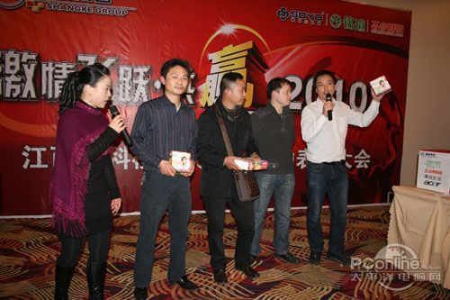 本次會議有眾多經銷商應邀赴會,更有來自NVIDIA和intel的嘉賓光臨現場,其中包括來自NVIDIA公司的彭華先生,以及INTEL公司的吳偉先生。而我們太平洋電腦網江西站作為到會的媒體代表,也被作為嘉賓介紹給大家。與上面的幾位重量級人物一起被主持人隆重介紹給廣大商家,筆者實在是感到有點汗顏!會議首先由NVIDIA公司的彭華先生為大家介紹阿凡達與NVIDIA的淵源(原來《阿凡達》出色的CG效果可是由NVIDIA的顯卡打造而成的)以及NVIDIA公司的新技術與政策。然后再由江西商科總經理吳暉先生講話,再后就是對2009年度成績突出的商科合作伙伴進行表彰頒獎(獎品非常豐厚哦,竟然是臺電上網本)。最后就是激動全場的抽獎活動了!