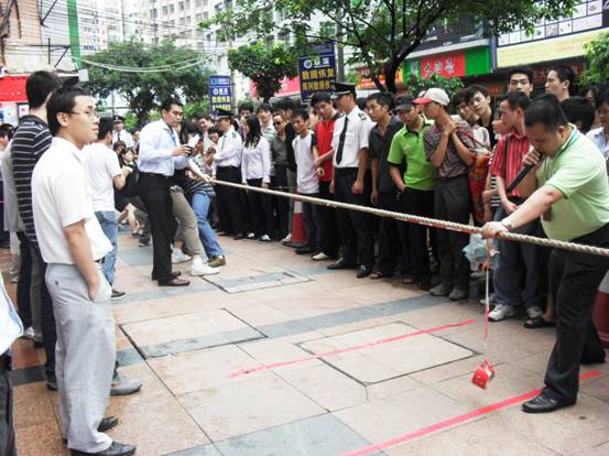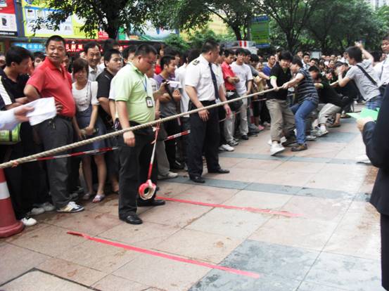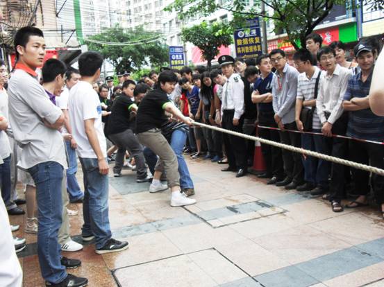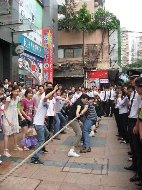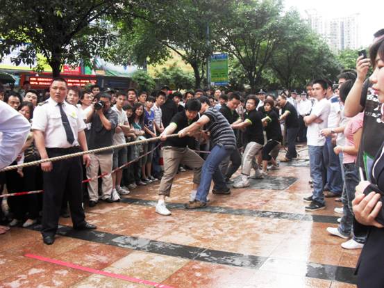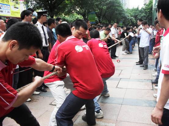 加油加油加油,,隊(duì)員們連吃奶的力都使上了,標(biāo)志帶向前移動(dòng)一下,眼看就要被拉過去了,但每一個(gè)人都沒有放棄,使出全身力量,拉拉隊(duì)的聲音早就沖過云宵,叫喊聲響成一片,每個(gè)人都快瘋掉。只見秦明和盧健華兩位份量級(jí)的人物向后一倒,倒在地上,紅色標(biāo)記帶隨著這一拉,越過紅線,大家跳了起來,第一局,贏啦!
