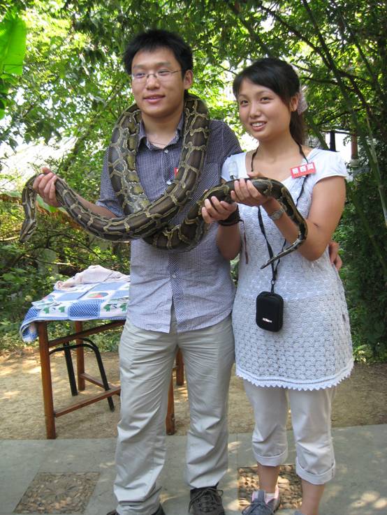 來蛇島當(dāng)然要和蛇島的主角合影嘍!瞧我們的美女和帥哥,摟著大蟒蛇一點(diǎn)也不怕。