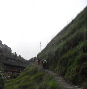 用山坡上崩裂的石板墊成的小路,因著山勢隨意騰挪,曲折蜿蜒中盡是坎坷。久居城市的觀光客,難免高一腳,低一腳,踉踉蹌蹌,如同跳起了“山間芭蕾”。好不容易望見了山寨的樓房,那路卻不再勇往直前,一會兒上攀,一會兒下坡,不知多少次騰越在山形梯田構成的拋物線上,人行其中,真象“烏蒙磅礴”中走動的泥丸。幾乎穿過了整個山寨下午黃昏之前到達龍脊,它集壯麗與秀美為一體,堪稱天下一絕,入住最有壯族特色的吊腳樓客!巴情w"。