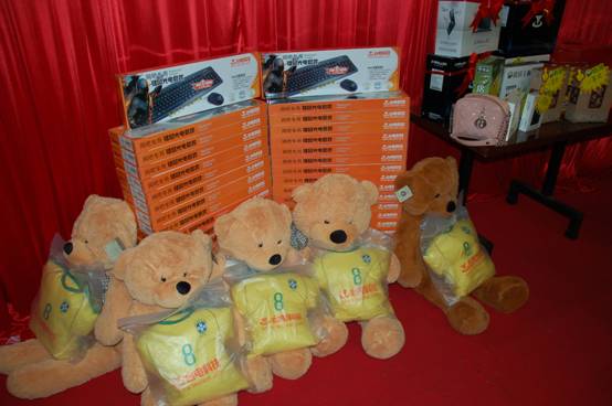 本次晚宴除開幾個大獎以外,也特意為到場的每一位經(jīng)銷商朋友準(zhǔn)備了鼓勵獎,獎品分別為臺電U盤。攝像頭。鍵鼠套裝。電影票。抱抱熊等等,作為禮物送給了所有朋友。。