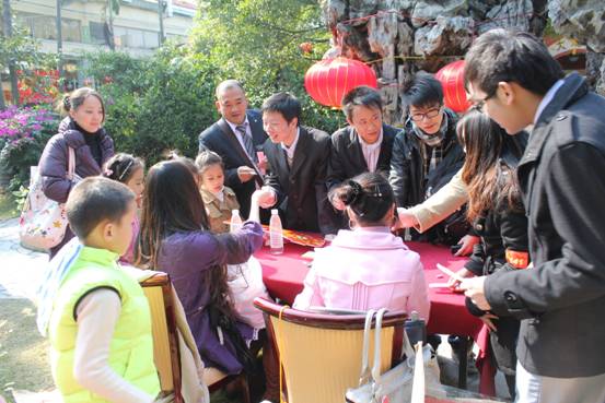 整個會場內(nèi)外都布置的很漂亮,花園里掛著許多燈謎,答對燈謎的人就可以領(lǐng)到小禮品,大家紛紛開動腦筋絞盡腦汁,場面十分熱鬧。