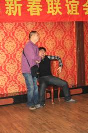 在玩搶凳子的游戲時,上演了兩位產品經理的精彩對決,十位選手參加,最后剩下的是銘瑄主板經理周紅光和梅捷主板經理李小剛,兩位經理你搶我奪,最后周經理用事實說明了一切,并用表情告訴我們,今年是我的,明年給你坐!看來,我們2011年的主板銷售一定會很好,從他們搶凳子的這種精神里知道了!