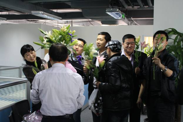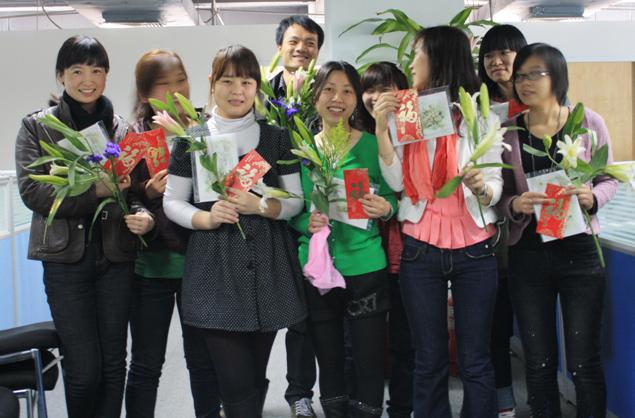 值3月8日來臨之際, 謹(jǐn)向公司所有女職員致以最美好的祝福! 3月8日,北京分公司為女員工舉辦了一場“美麗綻放,祝福女性”活動(dòng)。活動(dòng)中男同事們盡顯紳士風(fēng)采,出色地完成了綠葉的角色。 早上,女同事的辦公桌上都放著公司在她們到來前準(zhǔn)備好的祝福卡片。看都卡片上溫馨的話語,讓女同事們感動(dòng)不已。9:30剛剛到,一大束鮮花就被送到公司辦公室,鮮花的到來將“美麗綻放,祝福女性”活動(dòng)推向了高潮。寫字樓辦公區(qū)的女同事先進(jìn)行了合影,之后大束鮮花被拆開。行政人事部宣布鮮花派送開始,男同事們便一擁而上地來取花,搶花的場面真是別開生面。