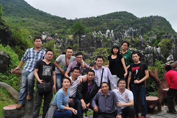 當天下午三點多我們又來到玉石林景區,它之所以叫玉石林是因為山上的石頭屬于玉白色,不同于昆明的花崗巖石林;一路行去,處處石林矗立、石芽裸露、奇峰突兀、石筍石柱狹縫密布;玉石林的小路涉及很科學,在不大的景區蜿蜒穿插,交錯疊行,可以使游人充分運動,又能從不同角度去欣賞玉石林的特色;大家逢路必走,有坡必上,特別是在“一線天”,累的大汗淋漓,較上午的游姑婆山累多了。。。