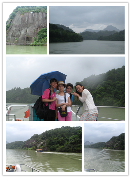 參觀完了元陽(yáng)石風(fēng)景區(qū),接下來(lái)就是“錦江游船”了,坐在游船上,欣賞著 “錦江畫(huà)廊”,大雨忽至,卻一點(diǎn)都不影響大家游玩的心情,隨著船上導(dǎo)游風(fēng)趣的講解,同事們這邊跑,那邊轉(zhuǎn)的,相機(jī)沒(méi)有一刻停歇,丹霞美景集中展現(xiàn),金龜朝圣、鯉魚(yú)跳龍門(mén)、、六指擒魔、觀音送子、笑面佛、茶壺峰、拇指峰、仙山瓊閣等美景點(diǎn)綴兩岸,目不暇接,群峰呈態(tài),妙不可言,當(dāng)然,這個(gè)也要考大家的眼力和想象力了。