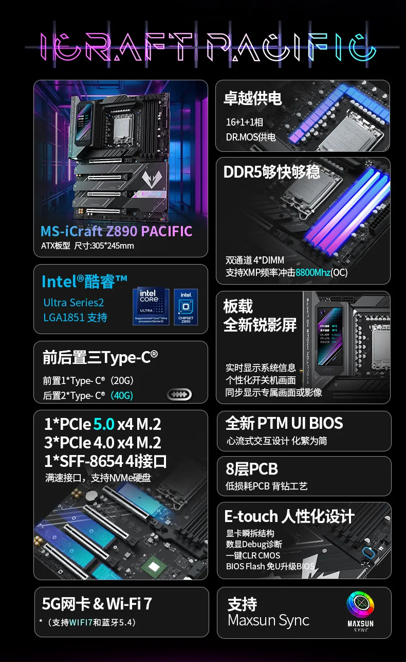 其中,在活動現(xiàn)場也有展出的MS-iCraft Z890 Pacific憑借出色的配置獲得了相當高的關注度。16+1+1相DR.MOS供電的強悍配置,充分發(fā)揮CPU潛能,配備4*高速DDR5內(nèi)存插槽,超頻沖擊8800MHz,8層服務器級PCB有效降低信號損耗、增強信號完整性、助力DDR5高速傳輸。