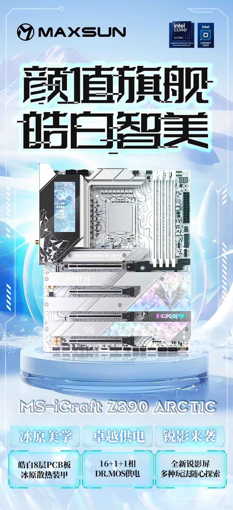 對于喜愛白色裝機的用戶,銘瑄特別準備了一款MS-iCraft Z890 Arctic。創新的冰原美學設計,特殊的鈦冰晶圖案和炫彩元素,配合冰原散熱裝甲,使其在功能與藝術之間達到了平衡。