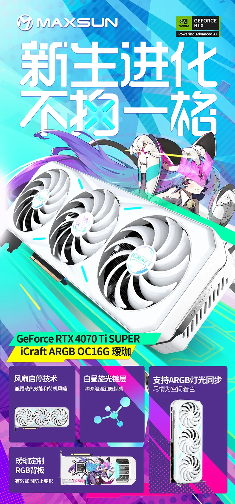 16GB、GDDR6X顯存搭配3風扇、8熱管,性能顏值雙出眾,無懼高強度運行,選擇銘瑄GeForce RTX 4070 Ti SUPER iCraft ARGB OC16G 璦珈顯卡作為理想搭檔,與NVIDIA App共同開啟全新的游戲和創作之旅吧!