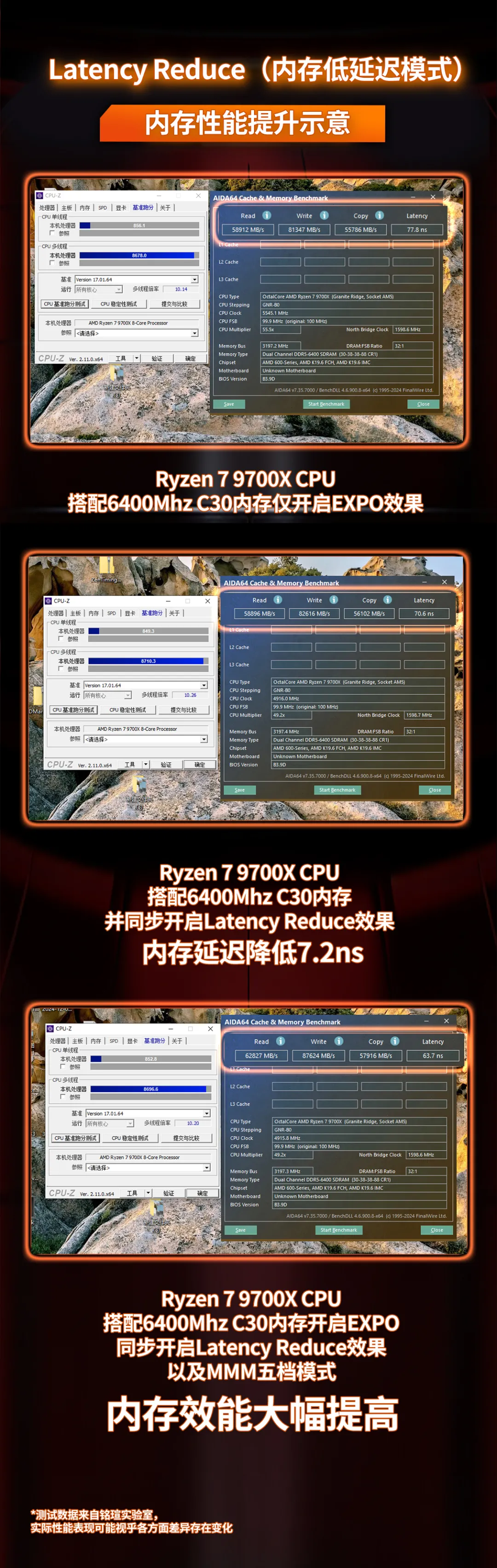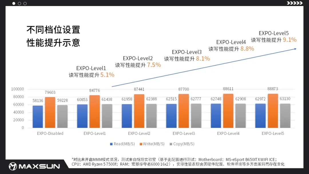 據銘瑄實驗室實測,開啟MMM模式Level5后對比未開啟MMM模式,讀寫性能提升9.1%,延遲減少14.8%,性能提升表現卓越(注:實際性能表現因硬件配置、軟件環(huán)境等多方面差異而存在變化,因架構差異原因,銳龍8000系列不支持該功能)。