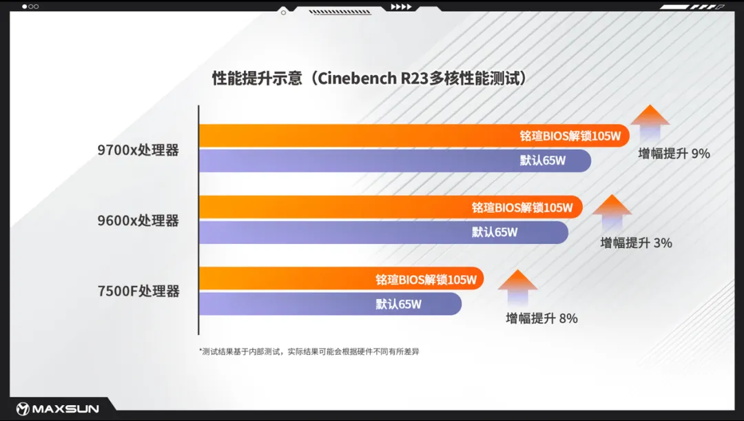 據銘瑄實驗室實測顯示,在開啟“65W CPU TURBO TO 105W”模式后,多款AMD處理器性能皆獲得顯著提升,其中9700X處理器提升最為明顯。