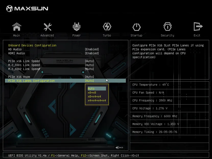 AMD B650芯片組提供PCIe 16X通道拆分功能,但大多數主板只能支持2個8X拆分,甚至有部分主板不支持此功能,銘瑄在此基礎上進行優(yōu)化,提供3個PCIe 16X通道拆分模式,滿足用戶不同的需求。3個PCIe 16X通道拆分模式分別為:X8+X8、X8+X4+X4和X4+X4+X4+X4,用戶可通過BIOS頁面中Advance(高級)—chipset Configuation(芯片配置)—PCIe X16 Lanes Configuration(PCIe X16通道配置)來設置此功能,從而根據自身需求更好地分配PCIe資源。