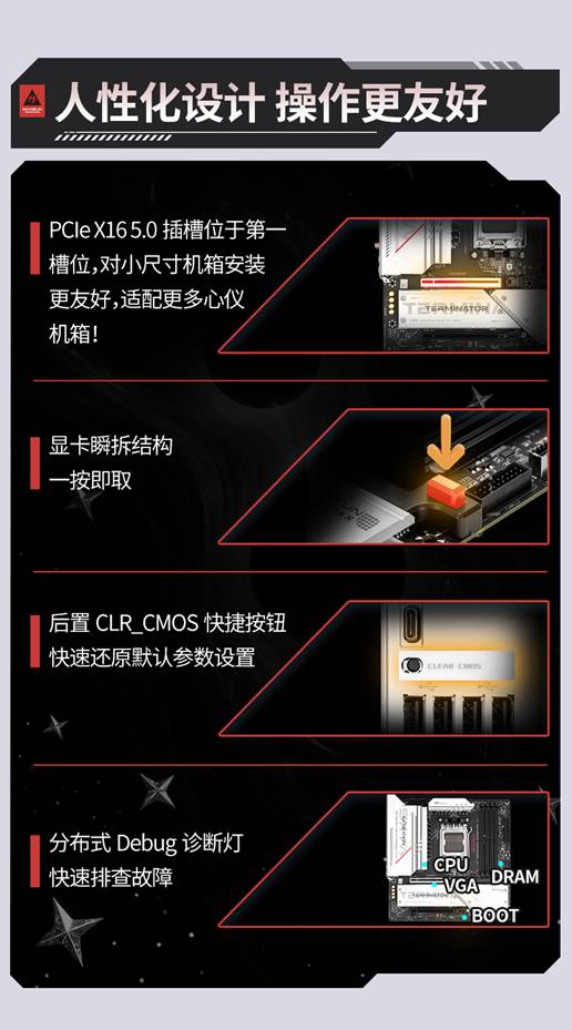 除了強(qiáng)悍的性能,銘瑄Terminator B850M PRO WIFI主板還加入了許多貼心設(shè)計(jì),如顯卡瞬拆結(jié)構(gòu),裝機(jī)維護(hù)時(shí)無(wú)需費(fèi)力拆卸螺絲;分布式Debug診斷燈能快速定位故障,小白也能輕松排查問(wèn)題;CLR_CMOS快捷按鈕,讓設(shè)置重置更便捷,全程省心省力,裝機(jī)體驗(yàn)直接拉滿(mǎn)。