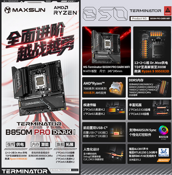 另外,銘瑄Terminator B850M PRO系列主板還推出了一款黑色版的銘瑄Terminator B850M PRO DARK WIFI。作為銘瑄終結(jié)者 PRO 系列的黑色款,這款主板將 “硬核美學(xué)” 貫徹到底,同樣的暗紅線條如機(jī)甲血脈般點(diǎn)綴,大面積的全金屬裝甲采用噴砂與拉絲工藝交織,打造出如同未來(lái)機(jī)甲般的冷峻質(zhì)感,低調(diào)中透著霸氣。無(wú)論是搭配側(cè)透機(jī)箱展示內(nèi)部硬件,讓每一處細(xì)節(jié)都成為視覺(jué)焦點(diǎn);還是打造簡(jiǎn)約風(fēng)、電競(jìng)風(fēng)主機(jī),這款黑色主板都能完美適配,輕松 hold 住各種裝機(jī)風(fēng)格,滿(mǎn)足不同用戶(hù)的審美偏好。