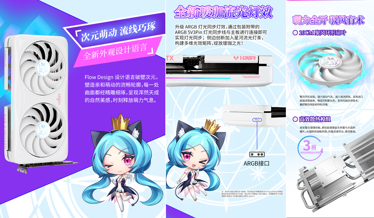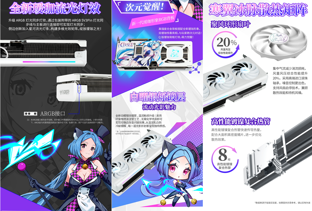 銘瑄GeForce RTX 5080 iCraft OC16G璦珈顯卡,升級 ARGB 燈光同步燈效,通過包裝附帶的ARGB 5V3Pin 燈光同步線與主板進(jìn)行連接即可實(shí)現(xiàn)燈光同步;側(cè)邊創(chuàng)新加入星河流光燈條,構(gòu)建多維光效矩陣,綻放璦珈之光! 高強(qiáng)度合金背板搭配全新璦珈形象,雙璦珈驚喜亮相,與玩家跨次元對話!Q版璦珈背板燈效,萌力覺醒! 性能上,依托Blackwell 架構(gòu)滿血核心與 16GB GDDR7 顯存,運(yùn)行《戰(zhàn)地 6》4K 高畫質(zhì)并開啟光線追蹤與 DLSS 4 超分辨率模式時,遠(yuǎn)景植被、遠(yuǎn)處建筑紋理清晰可見,夜間作戰(zhàn)時的手電筒光斑、爆炸火光等動態(tài)光影效果無拖影;支持 NVIDIA Reflex 低延遲技術(shù),鼠標(biāo)操作響應(yīng)速度提升顯著,近距離剛槍時瞄準(zhǔn)更準(zhǔn)確,再也不會因延遲錯失爆頭機(jī)會,助你在跨年戰(zhàn)場中所向披靡。