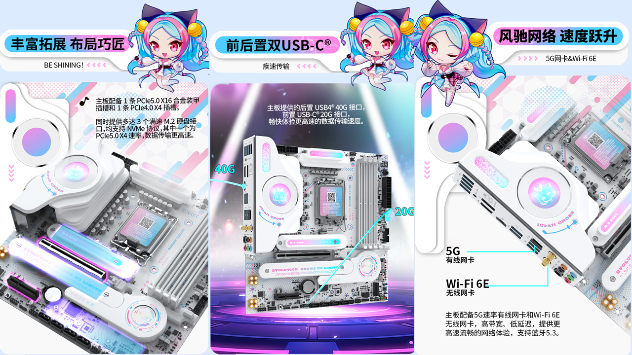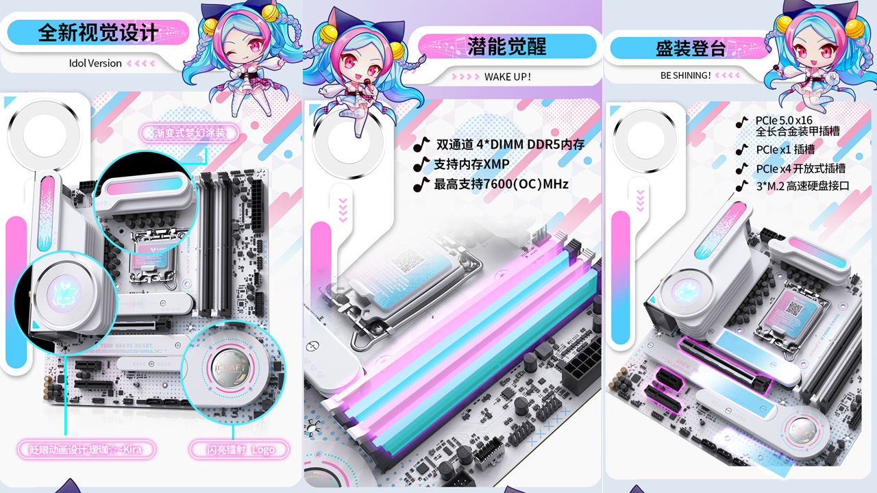 銘瑄iCraft B760M CROSS主板,外觀上粉藍(lán)配色,主板上的吉他裝甲以及多處的漸變設(shè)計(jì)點(diǎn)綴,加上全白的PCB和大面積的個性裝甲,吸睛度拉滿。值得一提的是主板上的創(chuàng)新式LED小屏幕,通電后可以發(fā)現(xiàn)這里是一個會眨眼的Q版璦珈,通過BIOS設(shè)置還能調(diào)節(jié)小璦珈的不同5種不同動作狀態(tài),給整個DIY主機(jī)注入了新的活力。除了出眾顏值,性能同樣不容小覷。供電方面,主板采用了12+1+1相的供電設(shè)計(jì),核心供電都是50A Dr.Mos,備4條雙通道DIMM的DDR5內(nèi)存插槽,優(yōu)化的線路布局,讓它擁有優(yōu)秀的超頻能力,支持內(nèi)存XMP,最高可至7600MHz。還搭配了一條PCIE5.0 X16全長合金裝甲插槽、一條PCIex1 插槽、和一條PCIe x4開放式插槽,存儲方面主板搭載3個M.2硬盤接口、4個6G SATA接口,無論是外接設(shè)備還是擴(kuò)容存儲,都能輕松滿足,適配宅家多樣化使用需求。