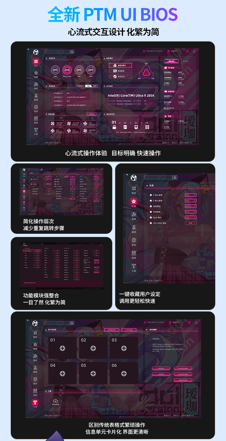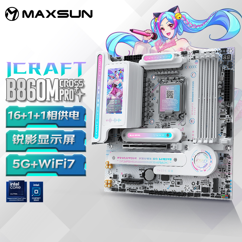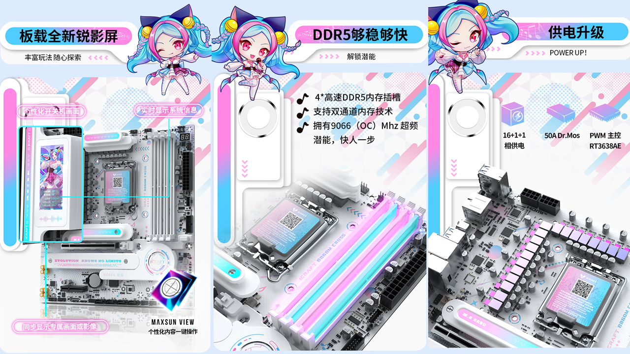 銘瑄iCraft B860M CROSS璦珈主板則為這份體驗(yàn)提供了堅(jiān)實(shí)支撐,采用新一代芯片組,相比 B760 主板性能進(jìn)一步提升,全面支持銘瑄全新的PTM UI BIOS,操作更便捷。主板配備LED小屏幕,通電后會呈現(xiàn)活力滿滿的小璦珈眨眼動畫,魅力滿分!對比上一代,供電升級采用16+1+1相供電設(shè)計(jì),核心供電50A Dr.Mos,輕松駕馭英特爾® 酷睿™ Ultra 9 處理器 285K;配備前后置雙USB-C®,后置USB4® 40G接口,支持最高40Gbps傳輸速率,數(shù)據(jù)傳輸更高速。并配備4條雙通道DIMM的DDR5內(nèi)存插槽,優(yōu)化線路布局,超頻能力更強(qiáng),具備9066(OC)Mhz超頻潛能,盡情釋放偶像實(shí)力。