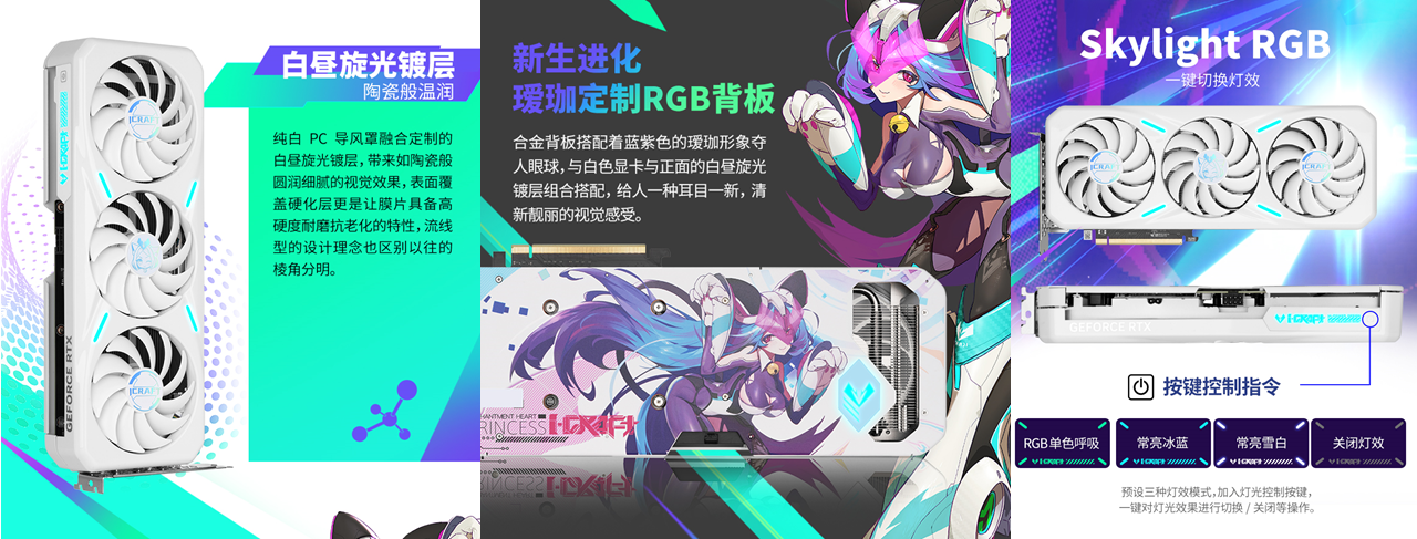 不僅性能能打,這款顯卡的外觀上設計清新亮眼,純白PC導風罩融合定制白晝旋光鍍層,觸感如陶瓷般圓潤細膩,定制璦珈合金背板上的藍紫色璦珈形象靈動吸睛,與正面鍍層相得益彰,為主機增添一抹清新亮眼的格調。更貼心配備一鍵燈光控制鍵,玩家可隨心切換燈效,讓柔和光影與《天國:拯救 2》的中世紀復古風格碰撞出獨特火花,打造專屬電競氛圍。