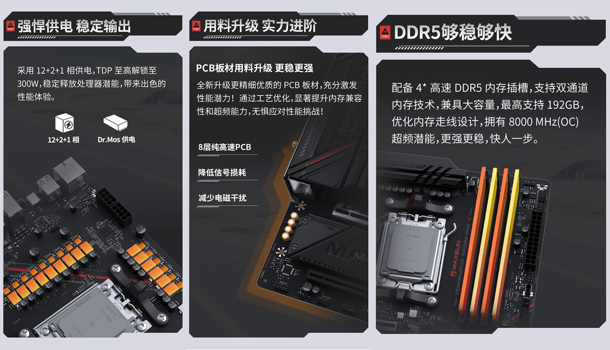 性能釋放方面,銘瑄iCraft B850 AIGA主板給出了旗艦級的硬核配置,能充分釋放AMD銳龍 7 9850X3D處理器的強悍性能。16+2+1 相供電設計搭配高效的核心 50A Dr.Mos,如同為處理器搭建了一座穩定的 “電力堡壘”, TDP至高解鎖至 400W,能為處理器提供持續穩定的電力輸出,確保性能拉滿。內存拓展同樣拉滿,4 條高速 DDR5 內存插槽支持高達 8400MHz(OC)的超頻頻率,無論是運行大型 3A 游戲時的高速加載,還是多任務并行處理時的流暢切換,都能迅速響應,操作絲滑到底,告別卡頓困擾。
