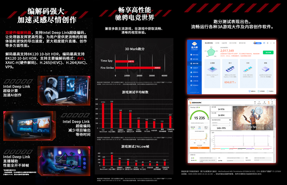 這款顯卡外觀設計上經典紅黑配色很具視覺沖擊力,紅與黑交織如同火焰撞入暗夜,神秘又霸氣,放在桌面就是顏值擔當。核心性能更是硬核,20 個 Xe 內核搭配 2850MHz 超高加速頻率,無論是 3A 游戲的高負載場景,還是專業創作的算力需求,都能流暢響應;12GB GDDR6 大顯存 + 456GB/S 高速帶寬,數據傳輸無瓶頸,復雜多任務處理也游刃有余。散熱與實用功能雙在線:雙 9CM FROST 正逆轉風扇搭配 11 幅密集扇葉,減少繞流、提升進風量,配合雙 6mm 鍍鎳復合熱管與定制銳盾背板,10 分鐘烤機溫度低至 68℃,高負載下也能冷靜運行;支持風扇啟停技術,兼顧散熱效能與待機靜音。接口配置豐富實用,3 個 DP2.1+1 個 HDMI2.1a 接口,多屏顯示、超高清影音、高分辨率游戲需求全覆蓋,還搭載雙硬件編解碼器,支持 AV1 格式與 Intel Deep Link 超級編碼,讓直播推流更順暢,視頻剪輯導出速度大幅提升,創作效率直接翻倍。