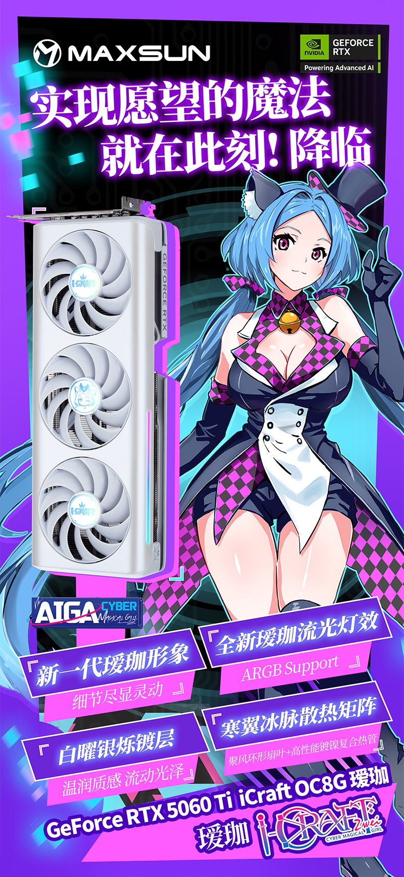 不僅性能能打,銘瑄GeForce RTX 5060 Ti iCraft OC8G 璦珈顯卡的顏值更是戳中玩家審美。全新白曜銀爍鍍層,溫潤(rùn)觸感升級(jí),采用環(huán)保免噴涂注塑工藝,無(wú)需化學(xué)噴涂就能呈現(xiàn)珍珠白漸變閃銀效果,從溫潤(rùn)乳白到冷峻銀輝,每一道光影折射都獨(dú)具質(zhì)感。搭配側(cè)邊創(chuàng)新加入的星河流光燈條,構(gòu)建出多維光效矩陣,配合升級(jí)的 ARGB 燈光同步功能,只需通過包裝附帶的 ARGB 5V 3Pin 燈光同步線與主板連接,就能實(shí)現(xiàn)燈光聯(lián)動(dòng),讓主機(jī)機(jī)箱瞬間變身 "次元舞臺(tái)"。高強(qiáng)度合金背板暗藏巧思,全新Q版璦珈形象萌趣十足,與正面白調(diào)形成呼應(yīng),個(gè)性化拉滿。