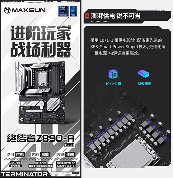 這款主板外觀上延續了終結者系列的經典配色,采用黑色 PCB 與銀色裝甲的搭配,整體風格沉穩大氣又不失電競范兒。相較于上一代產品,在性能和外觀上都得到了全面升級。主板搭載 10+1+1 相供電設計,配備更先進的SPS(Smart Power Stage)技術,更佳化每一相電源,電源調控更高效、更穩定。即便在處理器長時間高負載場景下,也能持續輸出強勁且平穩的電力,為 3A 游戲的高幀率運行、多任務的流暢處理筑牢動力根基。