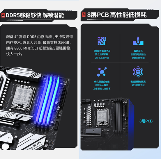 針對新處理器內存控制器的升級,銘瑄 Terminator Z890-A WIFI 主板在內存拓展與優化上做到完美適配。這款主板配備 4 條 DDR5 DIMM 內存插槽,支持雙通道技術,最大內存容量可達 256GB,更擁有高達 8800MHz 的超頻潛能,不僅兼容新處理器原生支持的 DDR5-7200 MT/s 內存,還能滿足硬核玩家的超頻需求,充分挖掘內存性能潛力。此外,主板采用 8 層服務器級 PCB 設計,結合背鉆工藝與菊鏈式優化布線,有效降低高頻信號傳輸中的損耗與串擾,消除電磁干擾與 Stub 效應,確保內存高速穩定傳輸,讓內存讀寫速度與多任務響應速度再創新高,與英特爾酷睿 Ultra 200S Plus系列處理器協同發力,實現 15% 的游戲性能提升。