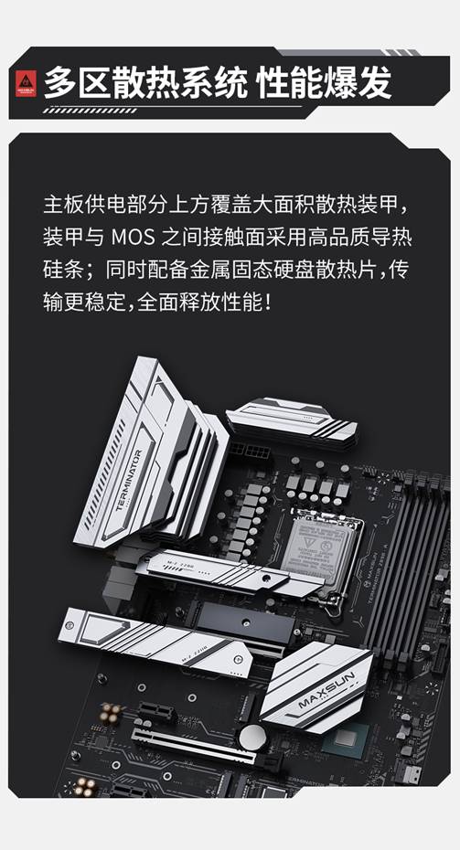 為保障高負載下的長期穩定運行,銘瑄 MS-Terminator Z890-A WIFI 主板在散熱設計上同樣下足了功夫,打造多區協同散熱系統,為性能釋放保駕護航。主板供電部分上方覆蓋了大面積散熱裝甲,裝甲與 MOS 之間的接觸面采用高品質導熱硅條,能夠快速導出供電模塊工作時產生的熱量;同時,主板還配備了金屬固態硬盤散熱片,有效降低固態硬盤在高速傳輸數據時的溫度,確保其傳輸穩定性,全面釋放存儲性能。在這套高效散熱系統的加持下,即便英特爾酷睿 Ultra 200S Plus系列處理器滿負載運轉,主板也能保持較低溫度,避免因過熱導致的性能降頻,讓玩家在長時間鏖戰游戲或進行專業創作時無后顧之憂。